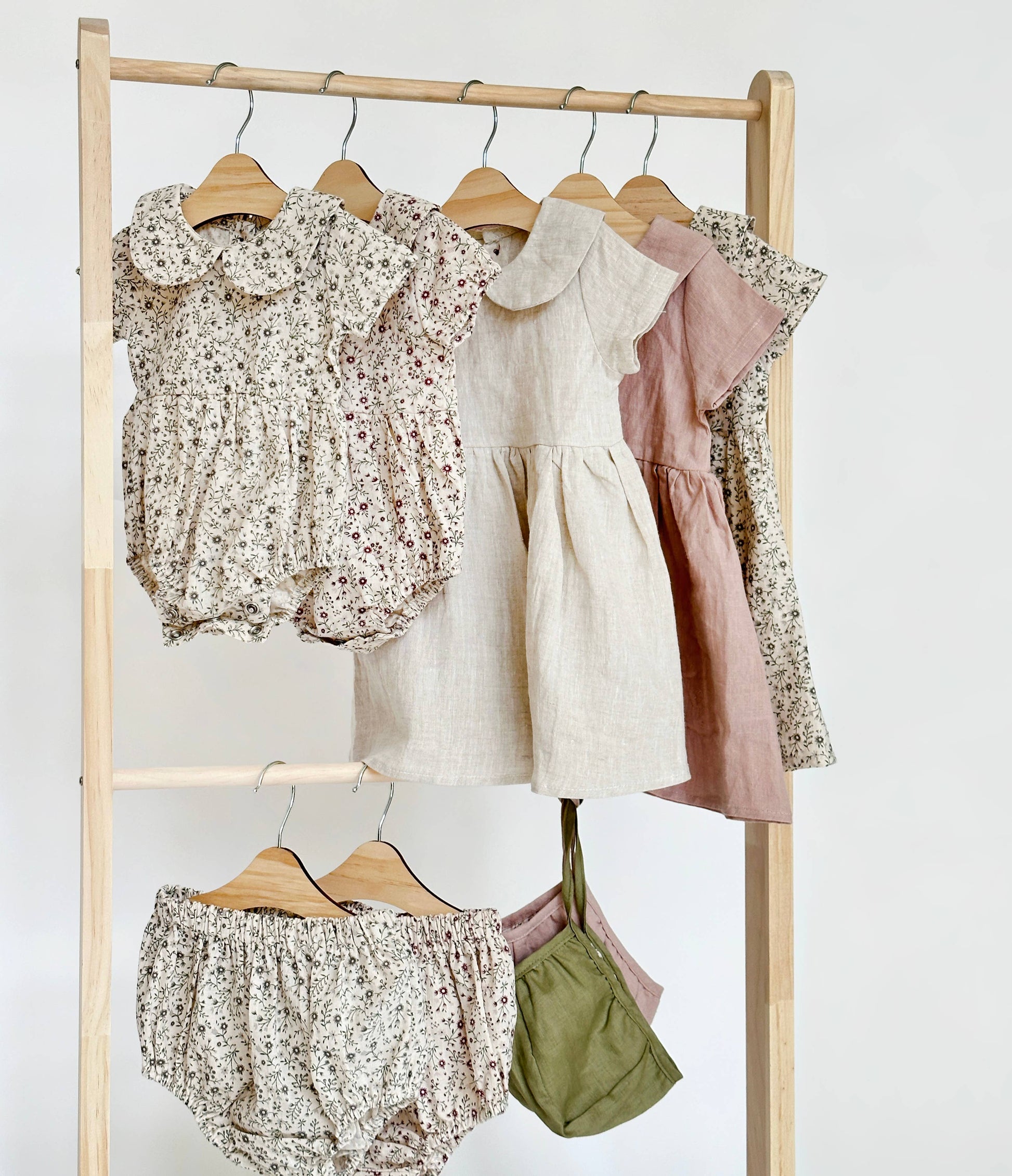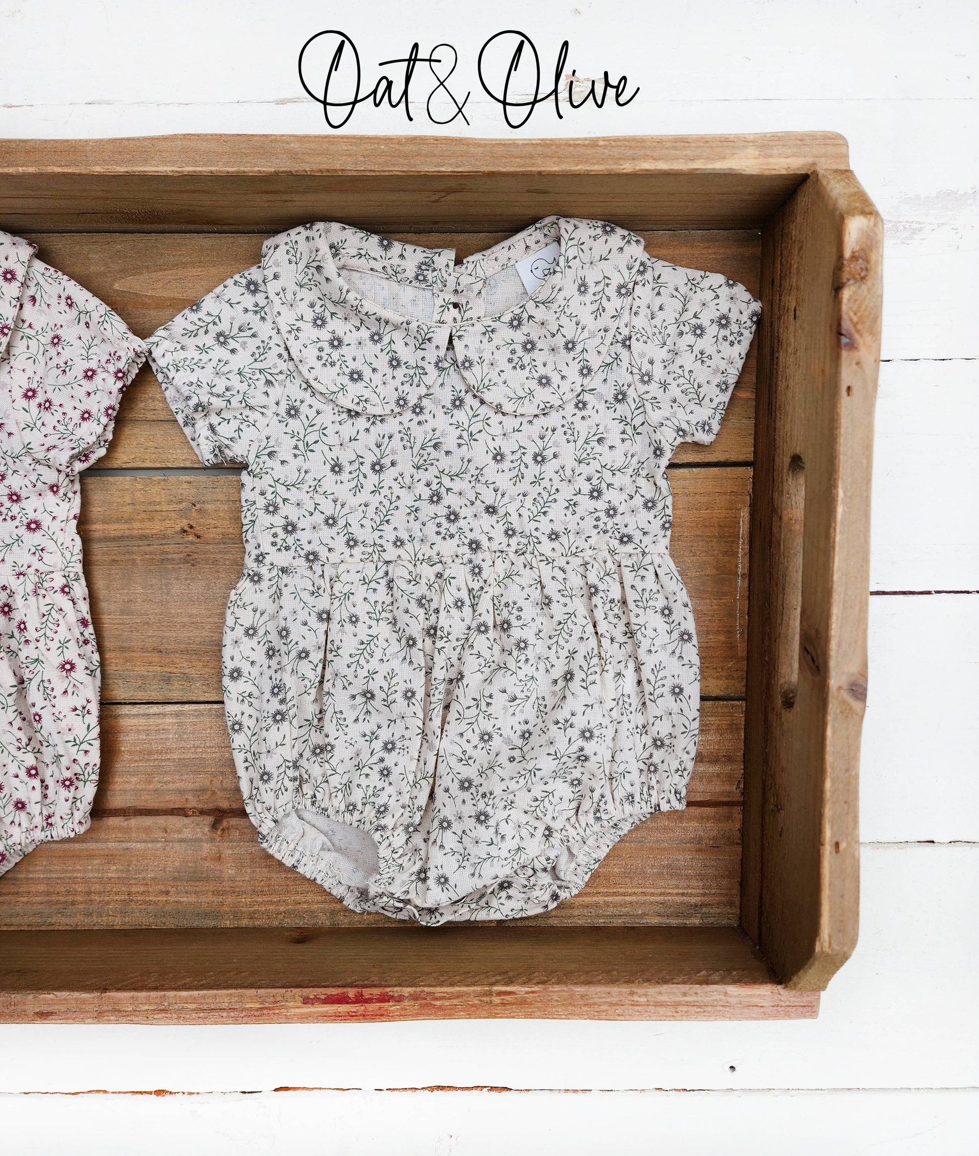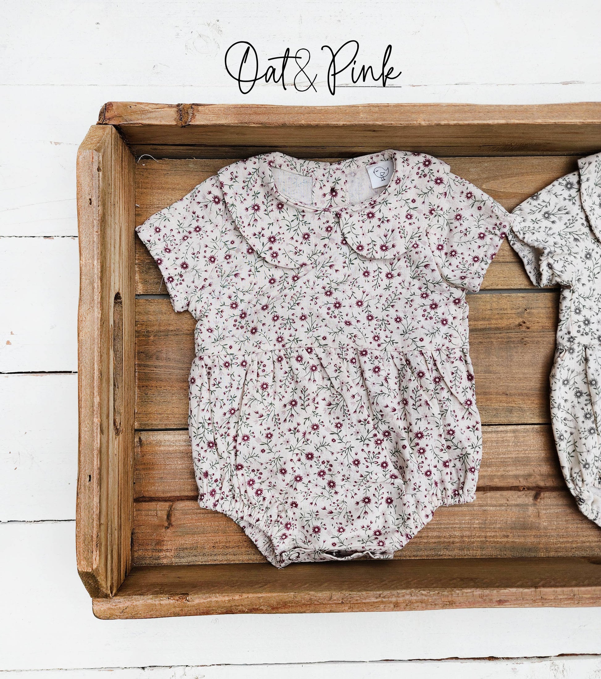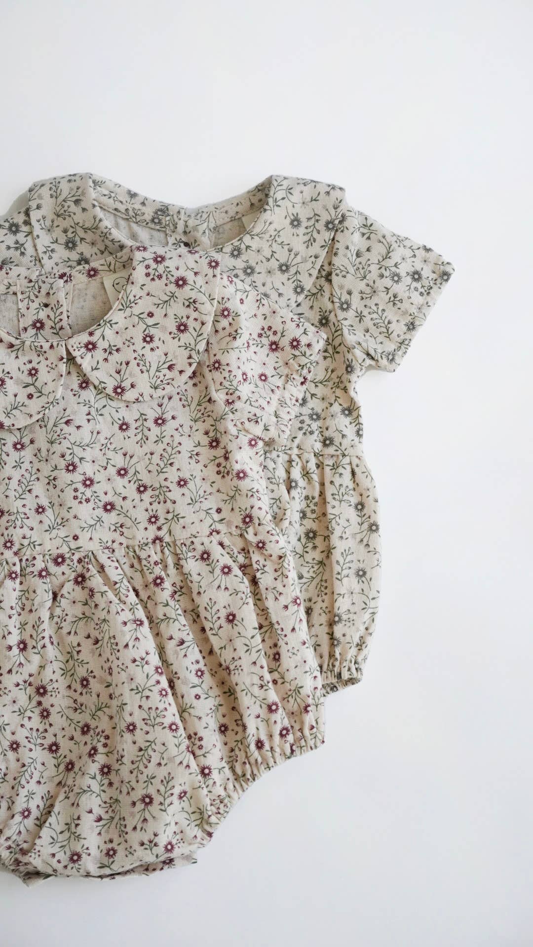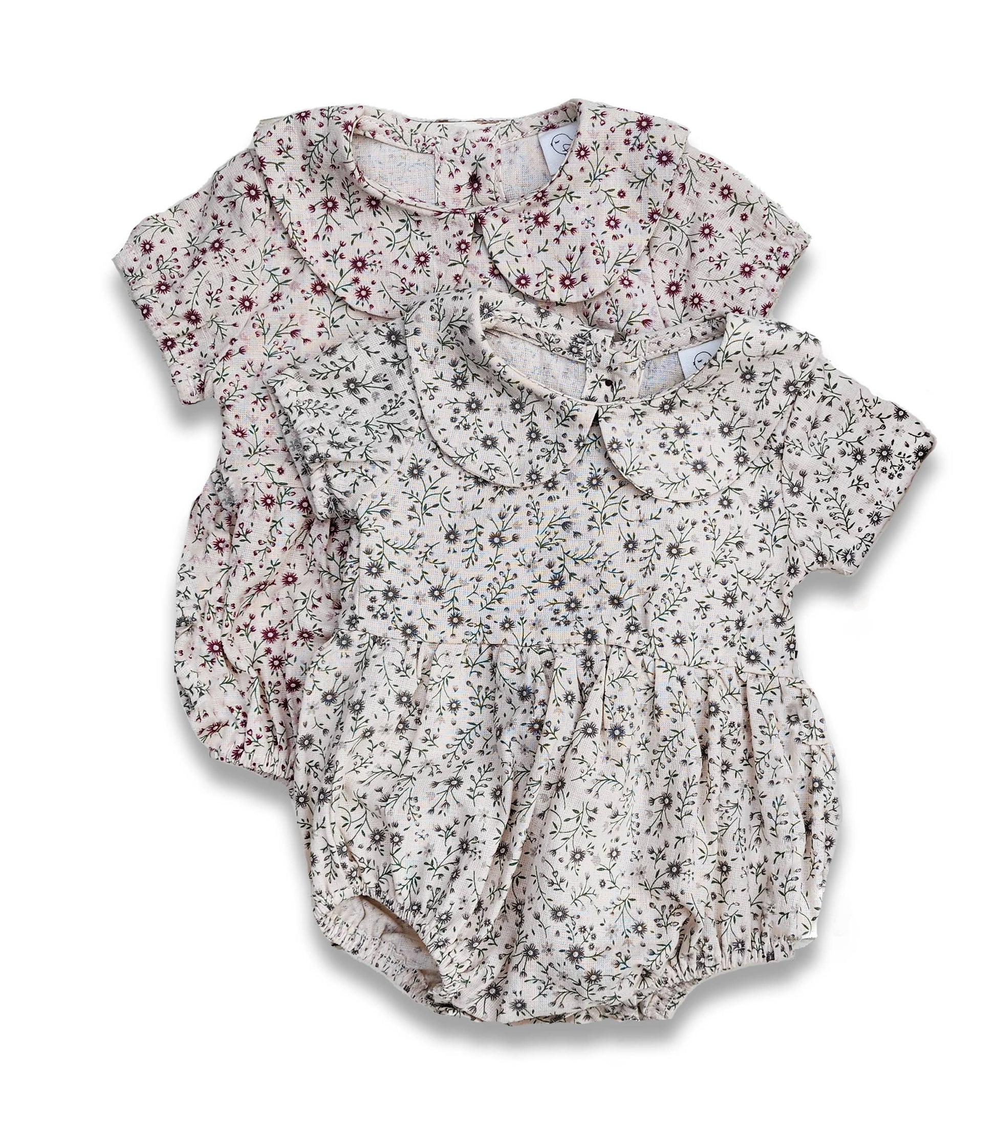 Allie Cotton Floral Short Sleeve Romper made with Peter Pan Collar and 4 buttons on back. Romper also has 3 snap button at the crotch for easy diaper changing Rompers made with 100% Cotton