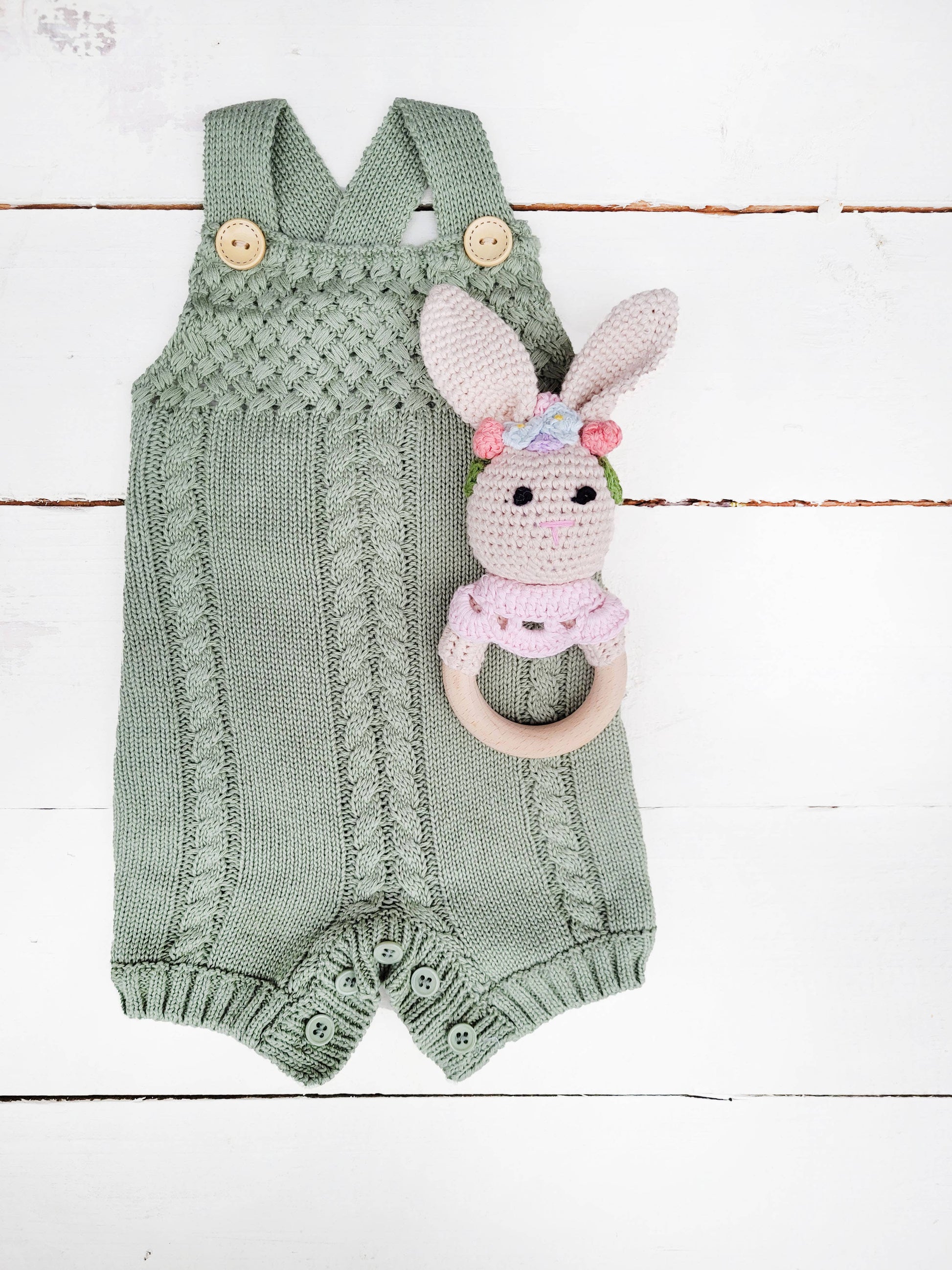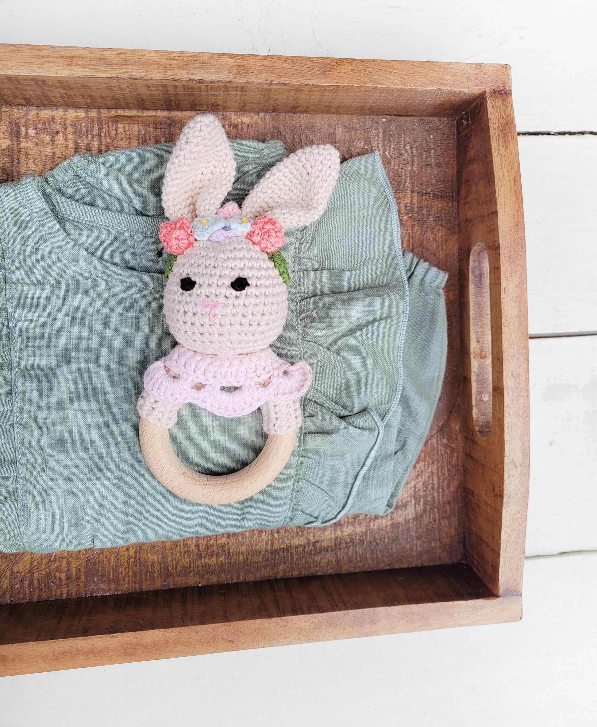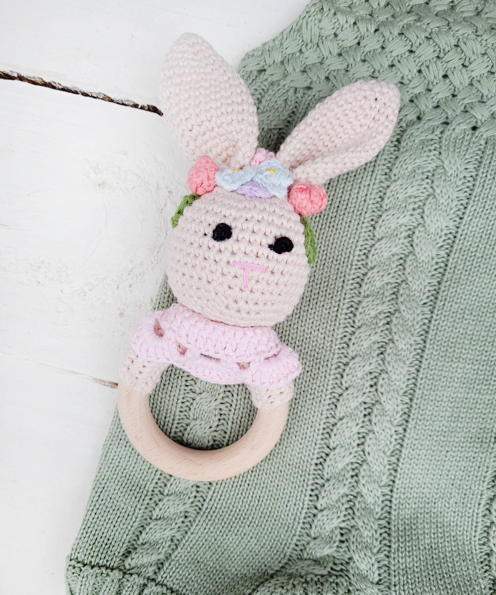 Handmade crochet cotton baby rattle on wooden teething ring girl bunny.