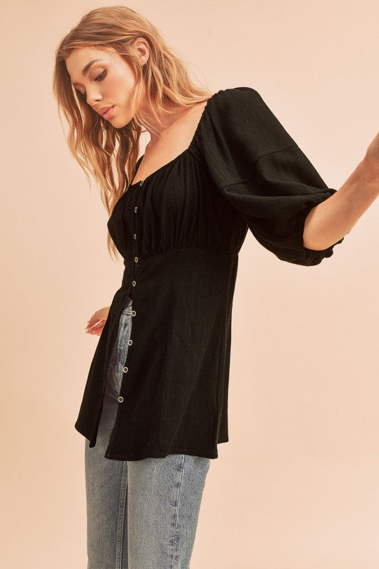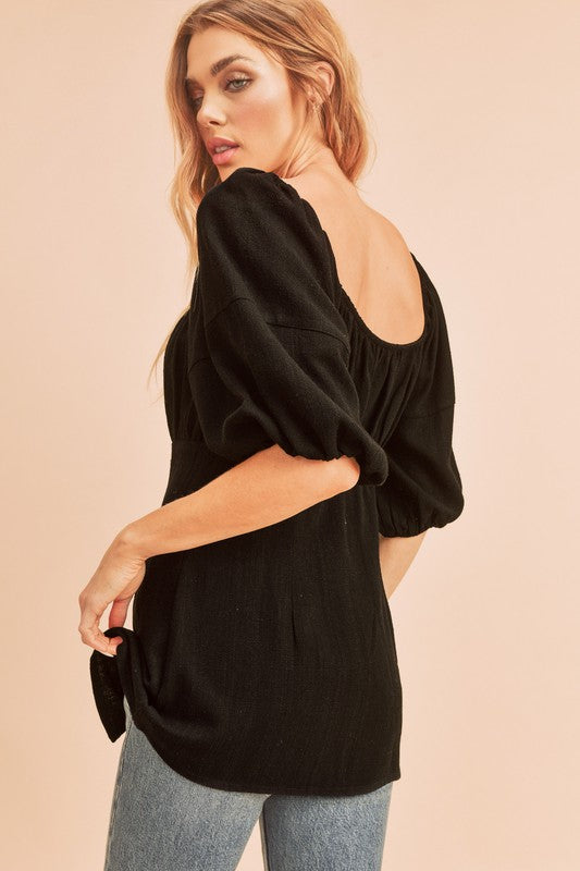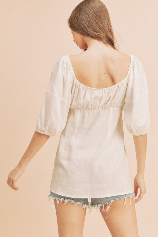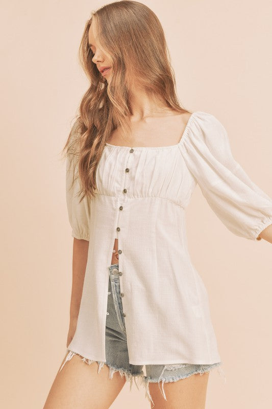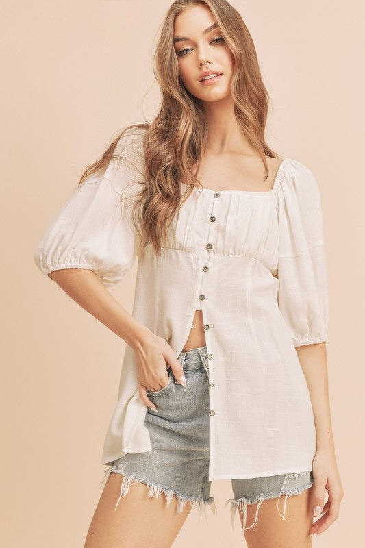 Lillet button down top is our favorite designed with a ruched square neck, puffed sleeves, and empire elasticized waistline for added shape.