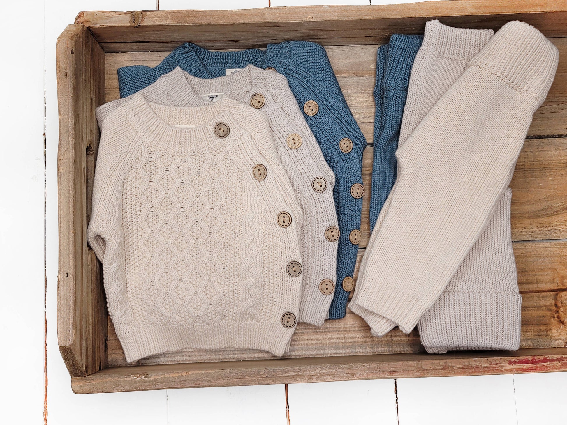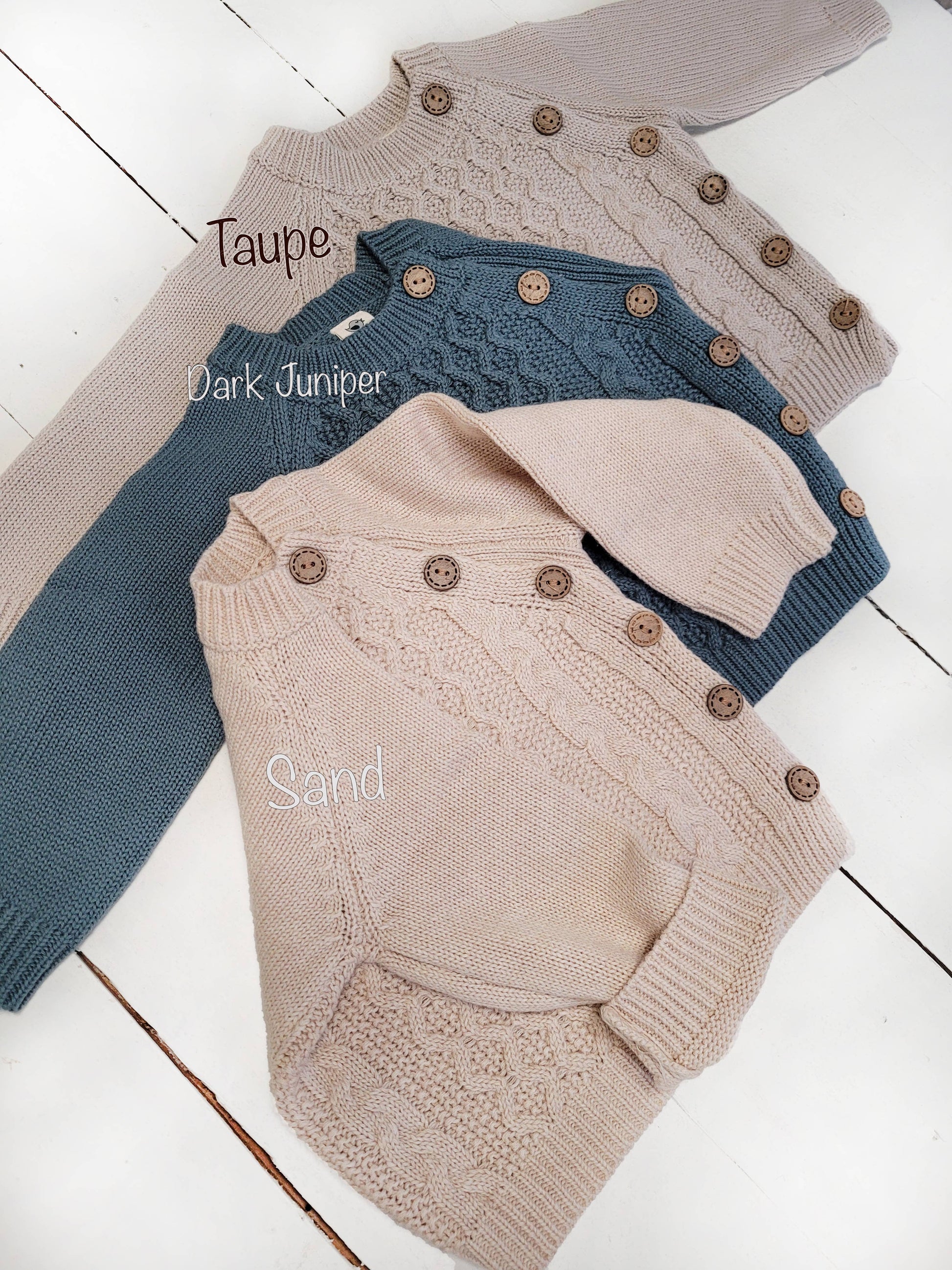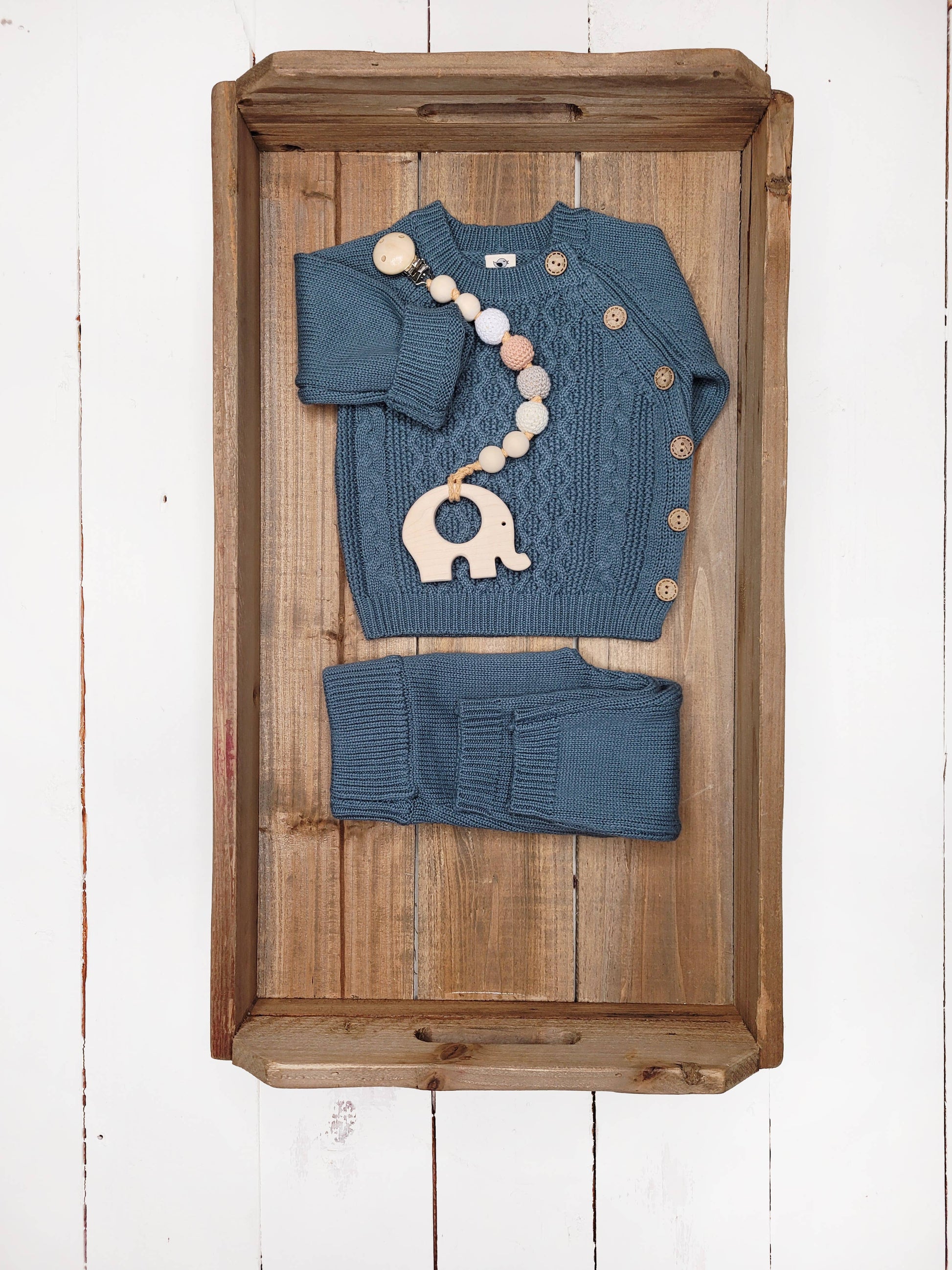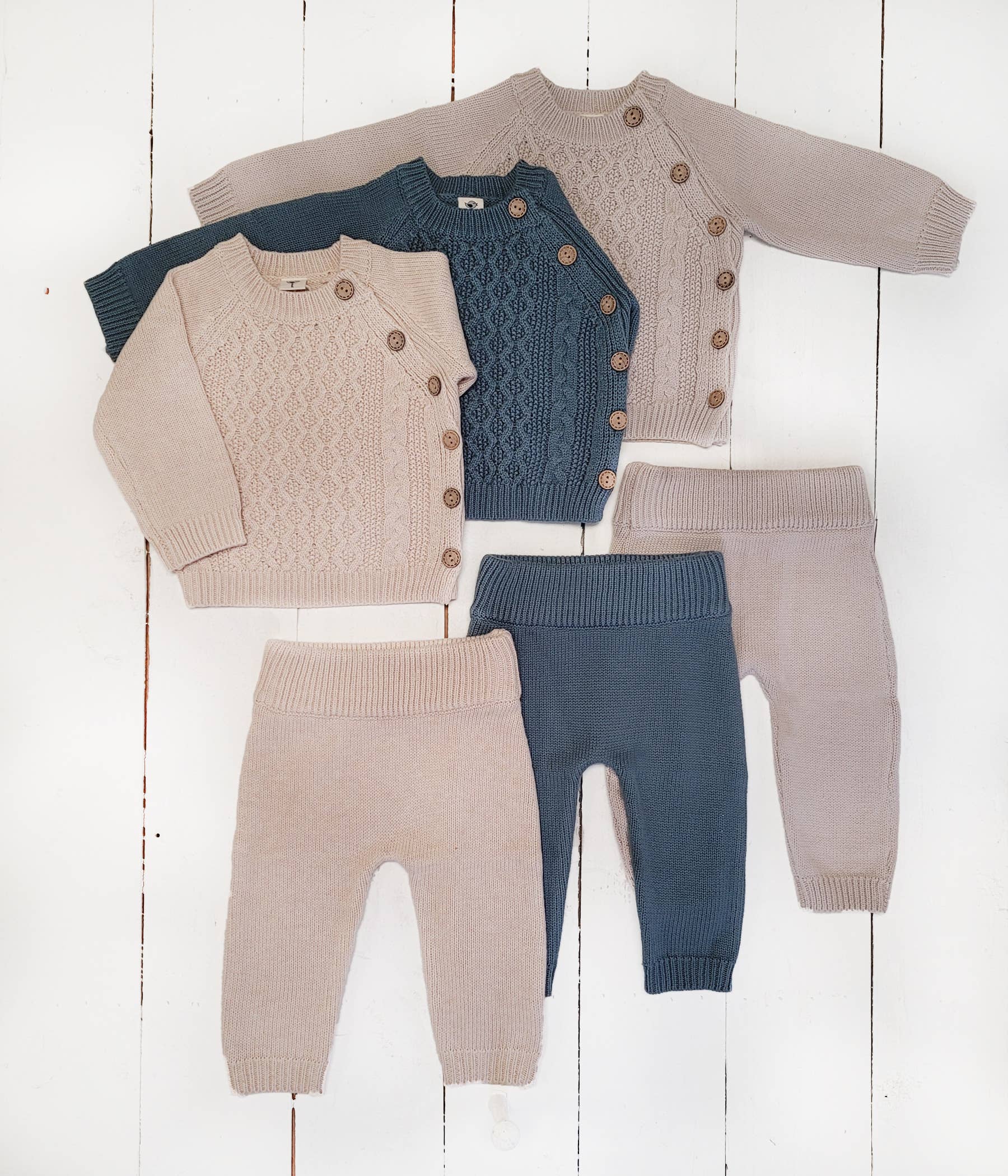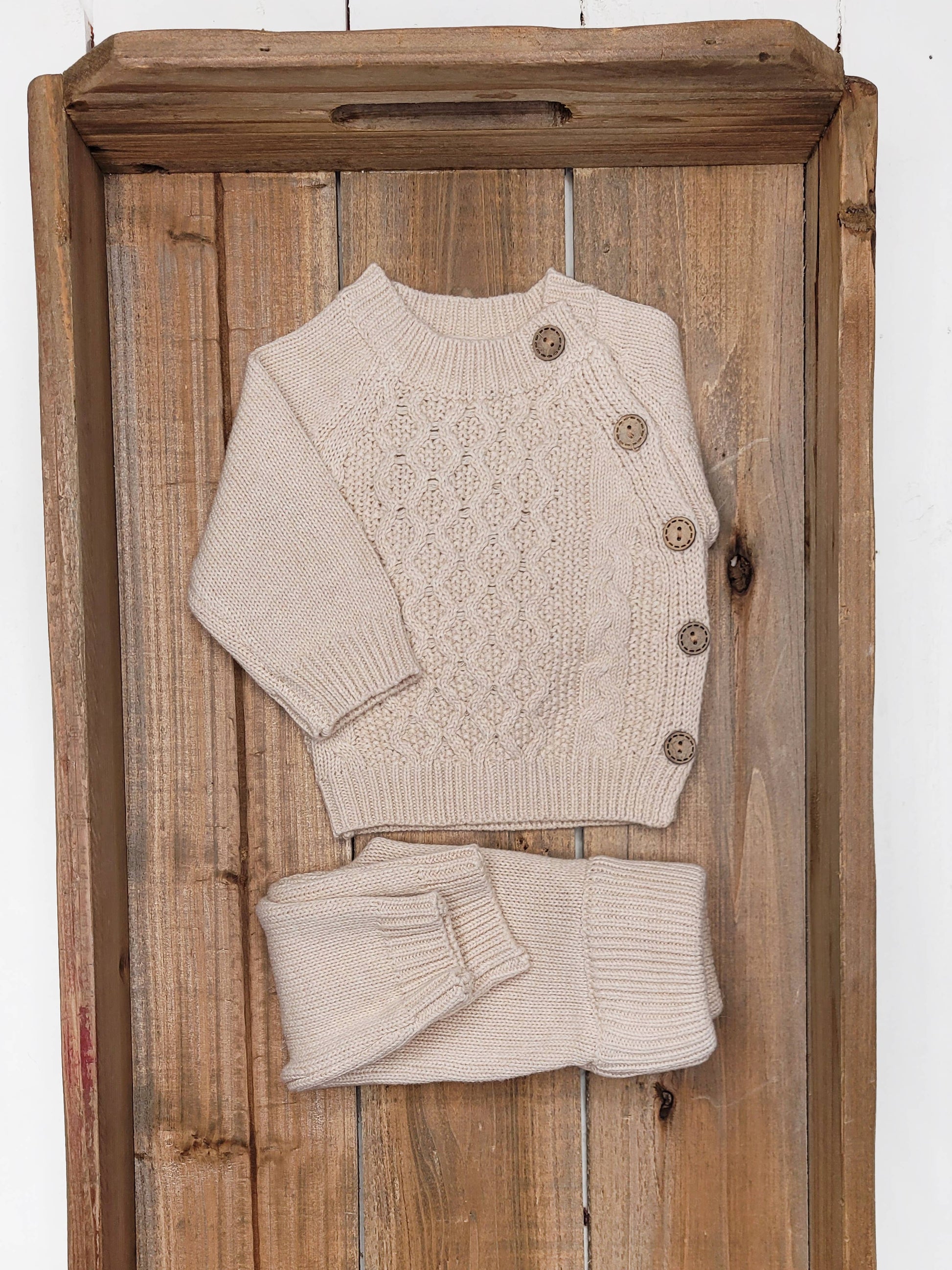 100% cotton knit 2 pc w/ wooden button on shirt, elastic band on pants and natural knit stretch. Available in gray, rustic brown, mauve. In sizes nb -18-24m.