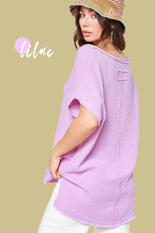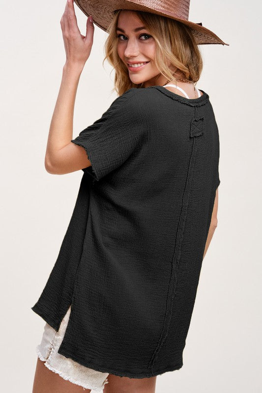 V-neck cotton gauze top with raw edge details and side slits at the bottom and high-low bottom hem.
