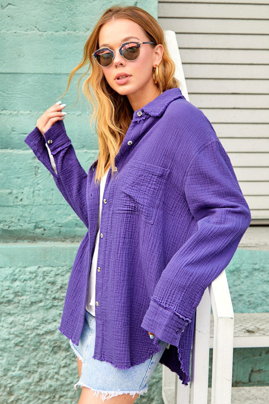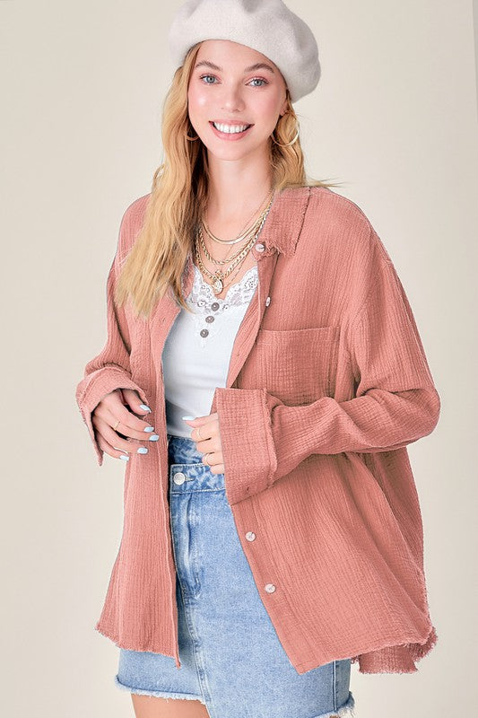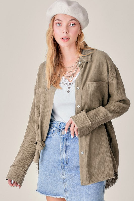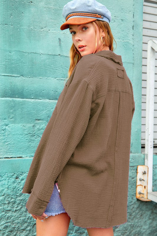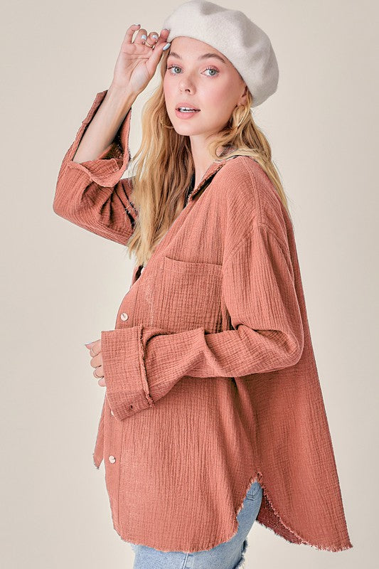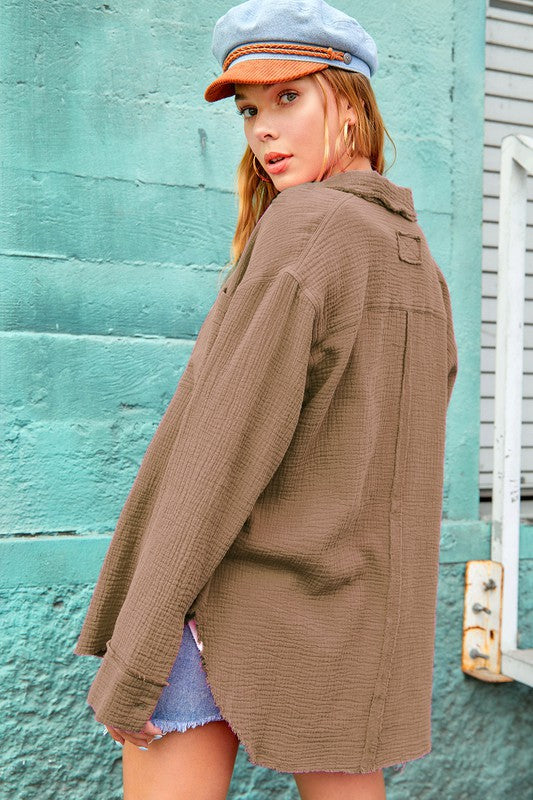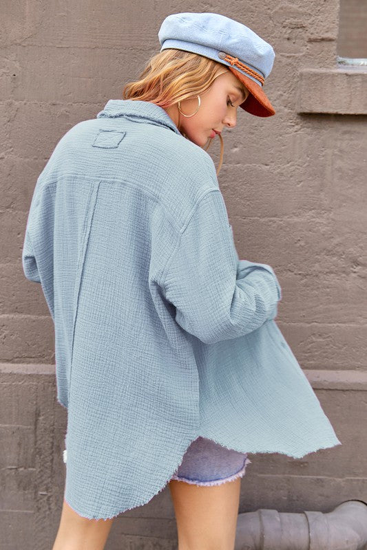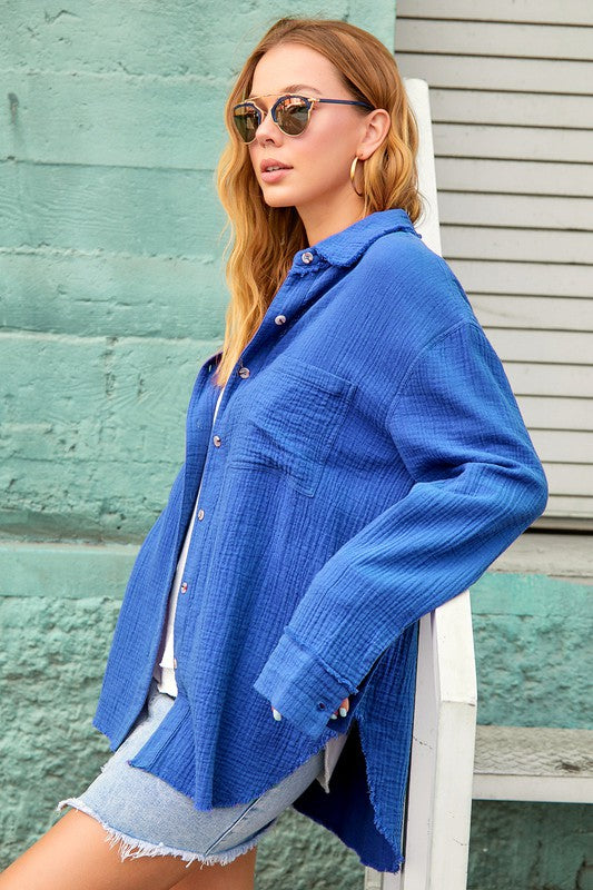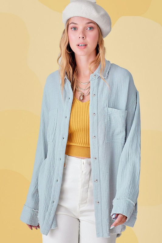 She's a cool and classic button down shirt with oversized, slouchy silhouette in a gorgeous crinkled gauze with dual front pockets. The raw hemline makes it the most effortless style no matter the season. It will be your year-round favorite!