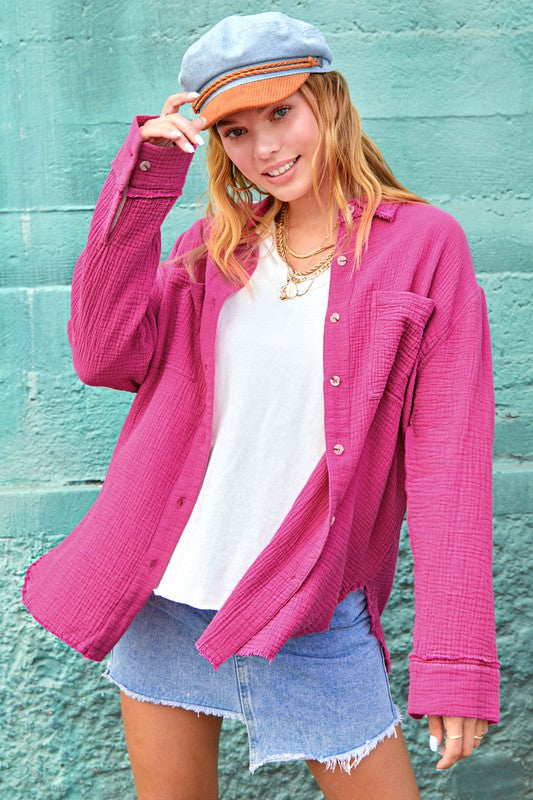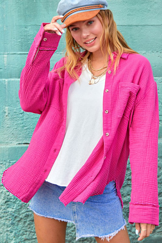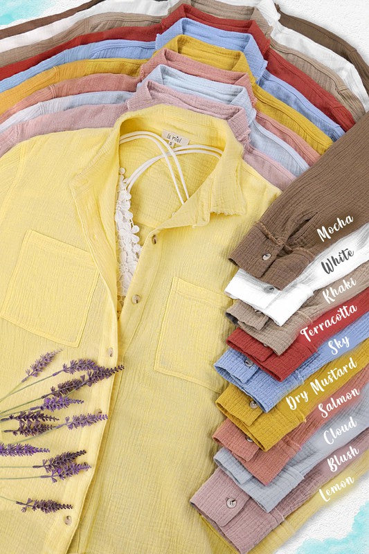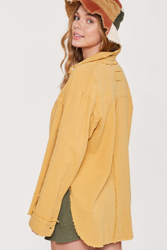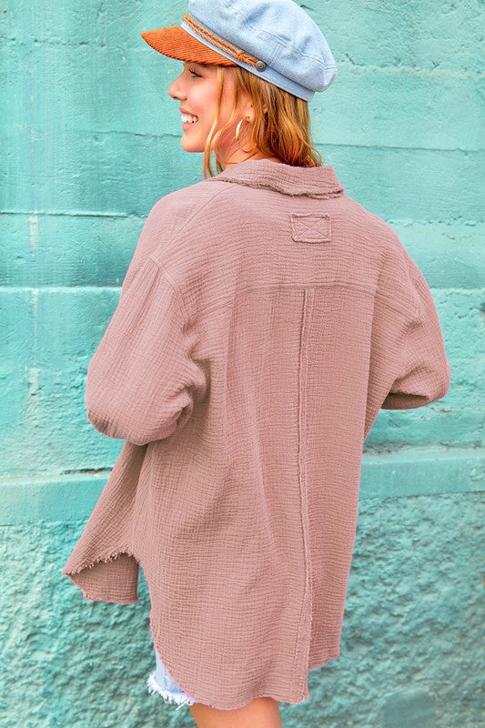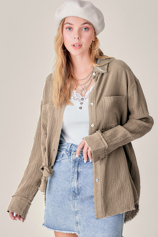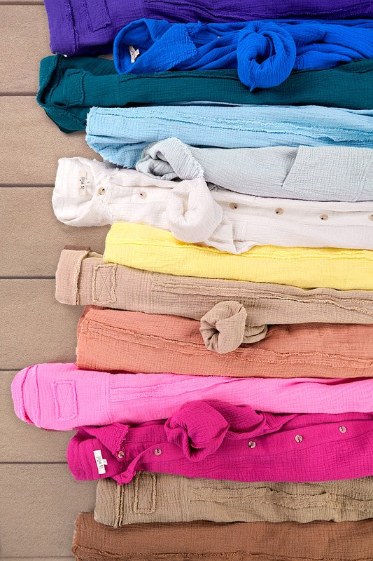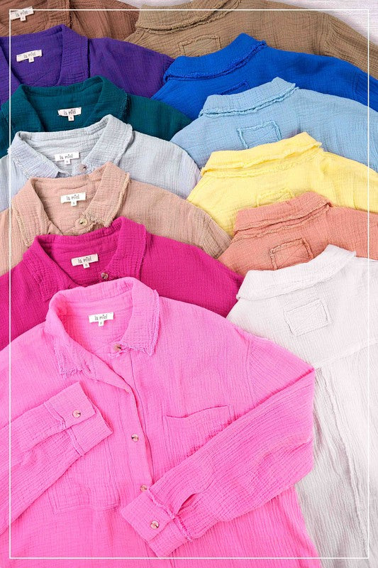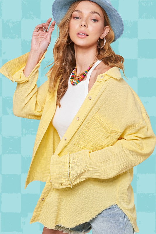 She's a cool and classic button down shirt with oversized, slouchy silhouette in a gorgeous crinkled gauze with dual front pockets. The raw hemline makes it the most effortless style no matter the season. It will be your year-round favorite!